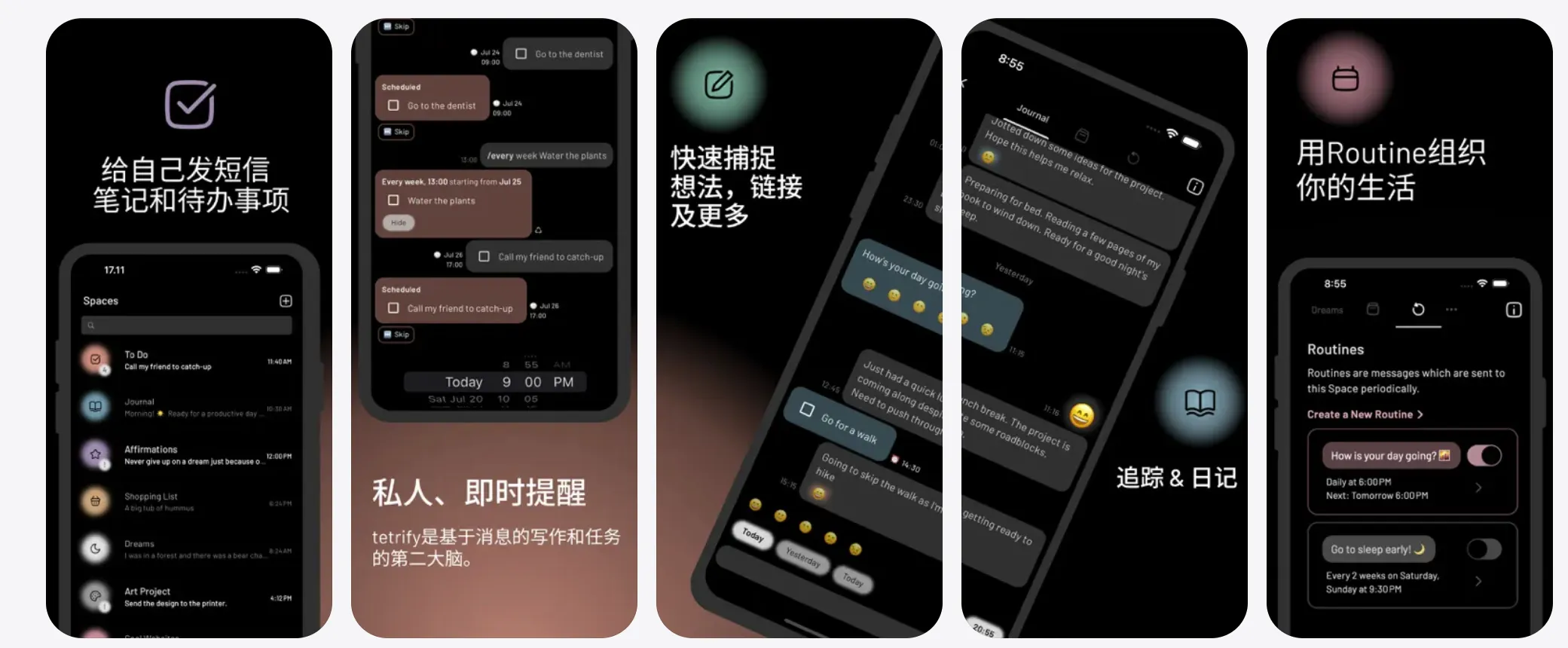 通过聊天让思绪井然有序。通过tetrify熟悉的基于文本的界面,将任何文本转化为笔记、提醒,并追踪习惯。 通过聊天即时捕捉 跳过复杂的界面。像给朋友发信息一样,将想法、提醒和思绪传达给自己。无需学习曲线——只需输入即可。灵感突现时,非常适合快速进行头脑风暴。 为一切提供智能聊天 为生活中不同的领域创建专用的聊天空间: - 笔记:即时捕捉稍纵即逝的思绪和想法 - 任务:将文本转化为可操作的提醒,并附带基于时间的通知 - 日记:通过私人消息追踪情绪,反思并提高自我意识 - 习惯:通过轻松的文本检查建立一致的Routine - 混合搭配:想在笔记空间中添加任务或追踪收据?创建适合您工作流程的自定义空间!